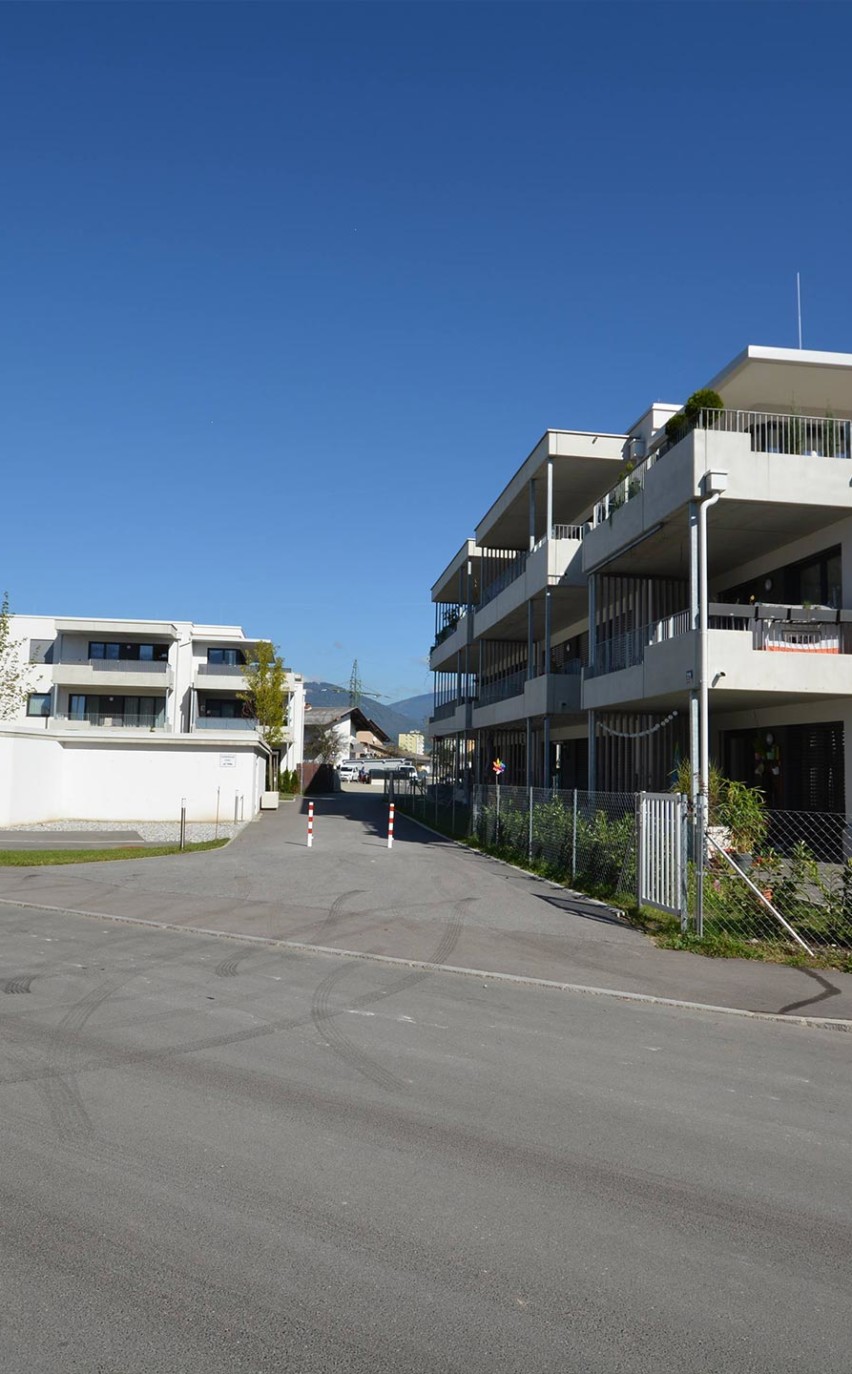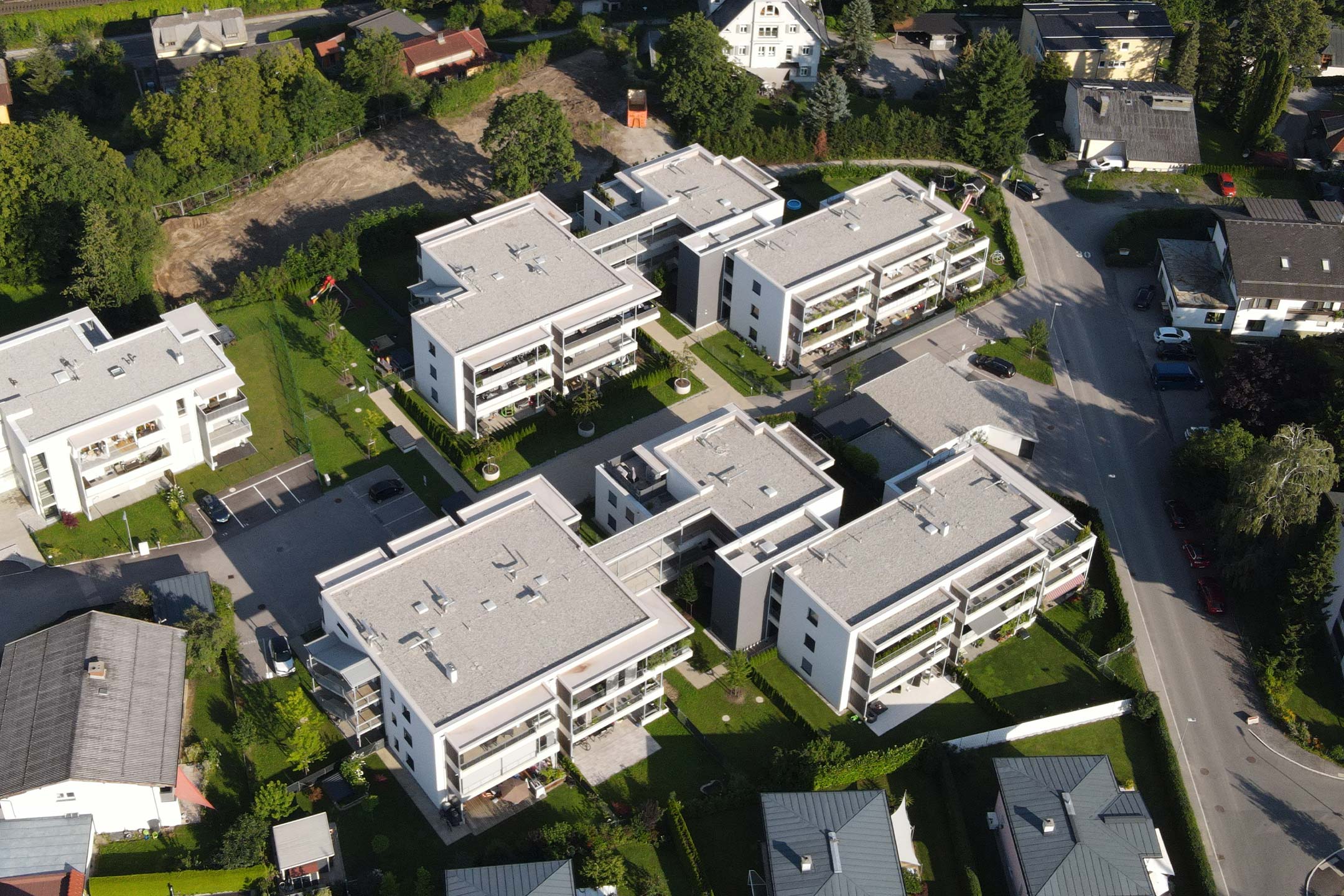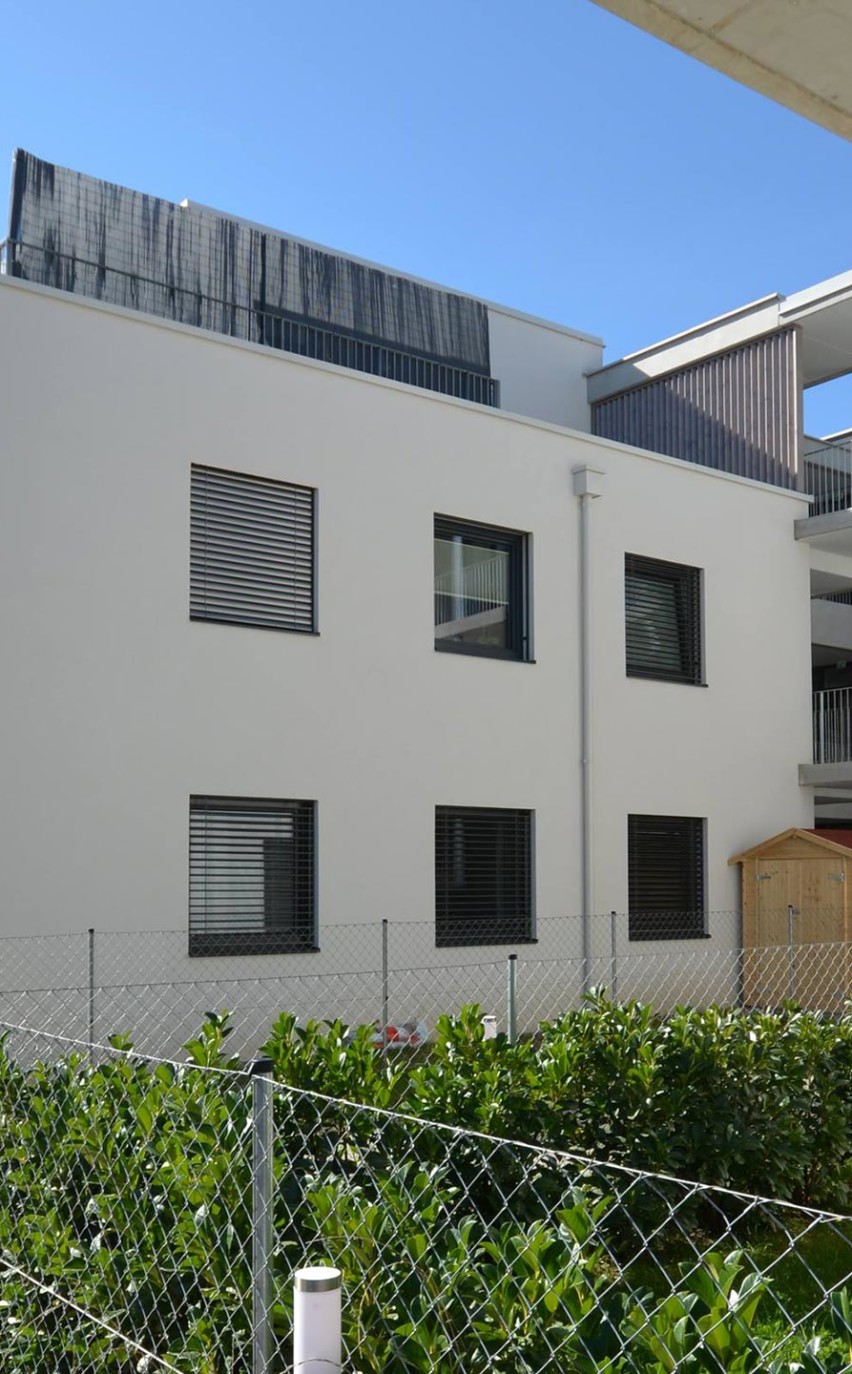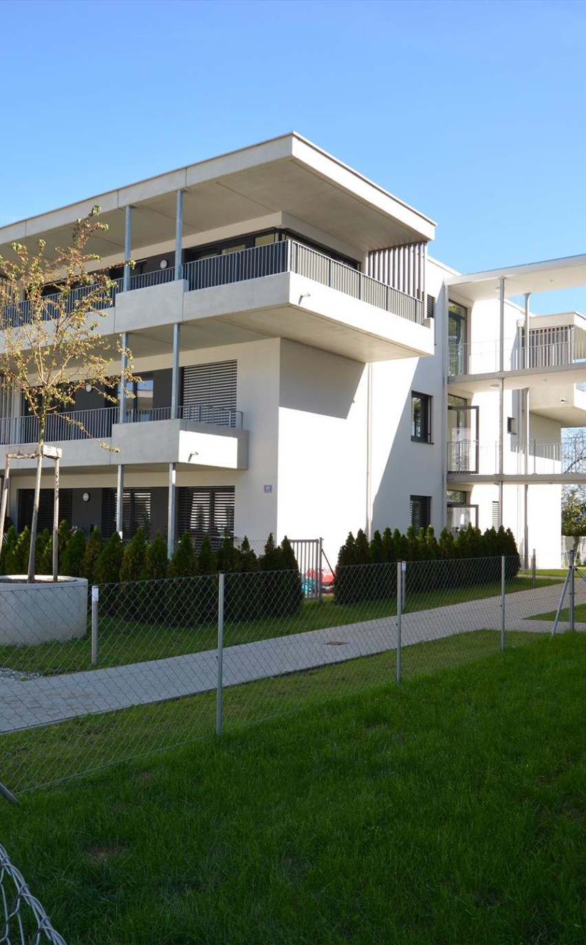 Das Design ist klar und schnörkellos: Vier kubische Baukörper, jeweils paarweise durch einen Laubengang verbunden, sind versetzt auf dem Grundstück angeordnet. In der Mitte der beiden Gebäudekomplexe erstreckt sich ein Innenhof – autofrei, damit Ihre Kinder beruhigt spielen können. Die Parkplätze befinden sich zum größten Teil in einer Tiefgarage, damit im Freien Platz für Grünflächen, Gärten und einen Spielplatz bleibt. Singles, Paare und Familien können sich hier ihren Traum vom eigenen Zuhause erfüllen.